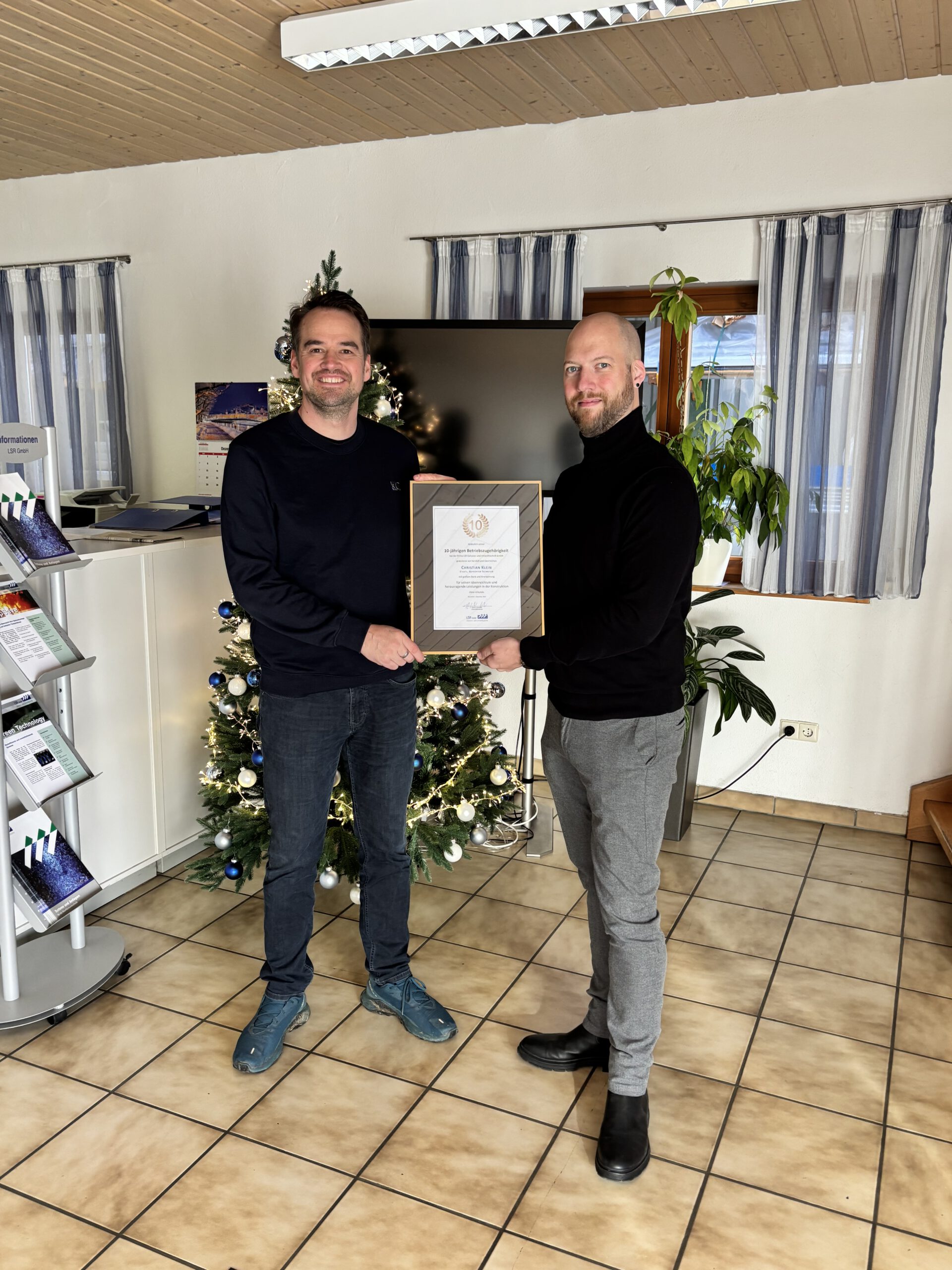 Ein besonderer Moment war die Ehrung unseres Mitarbeiters Christian Klein für 10 Jahre Betriebszugehörigkeit. Mit großem Dank würdigten wir sein Engagement und seinen langjährigen Einsatz für unser Unternehmen.